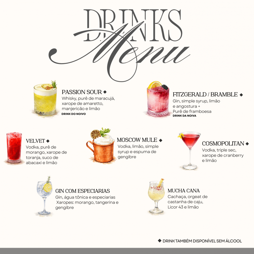 Os drinks serão preparados pela Drinks Co., e o cardápio completo estará disponível abaixo.